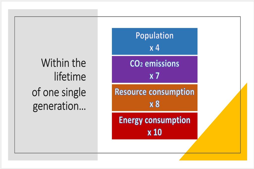 We are not on a sustainable path. Within the lifetime of one single generation the world population, global CO2 emissions, resource and energy consumption increased at an unprecedented rate.